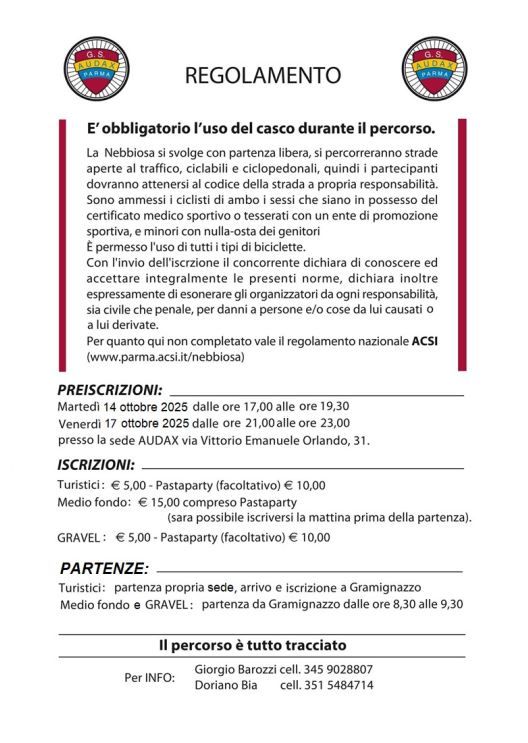 presso sede Audax Via Vittorio Emanuele Orlando, 31 - PARMA